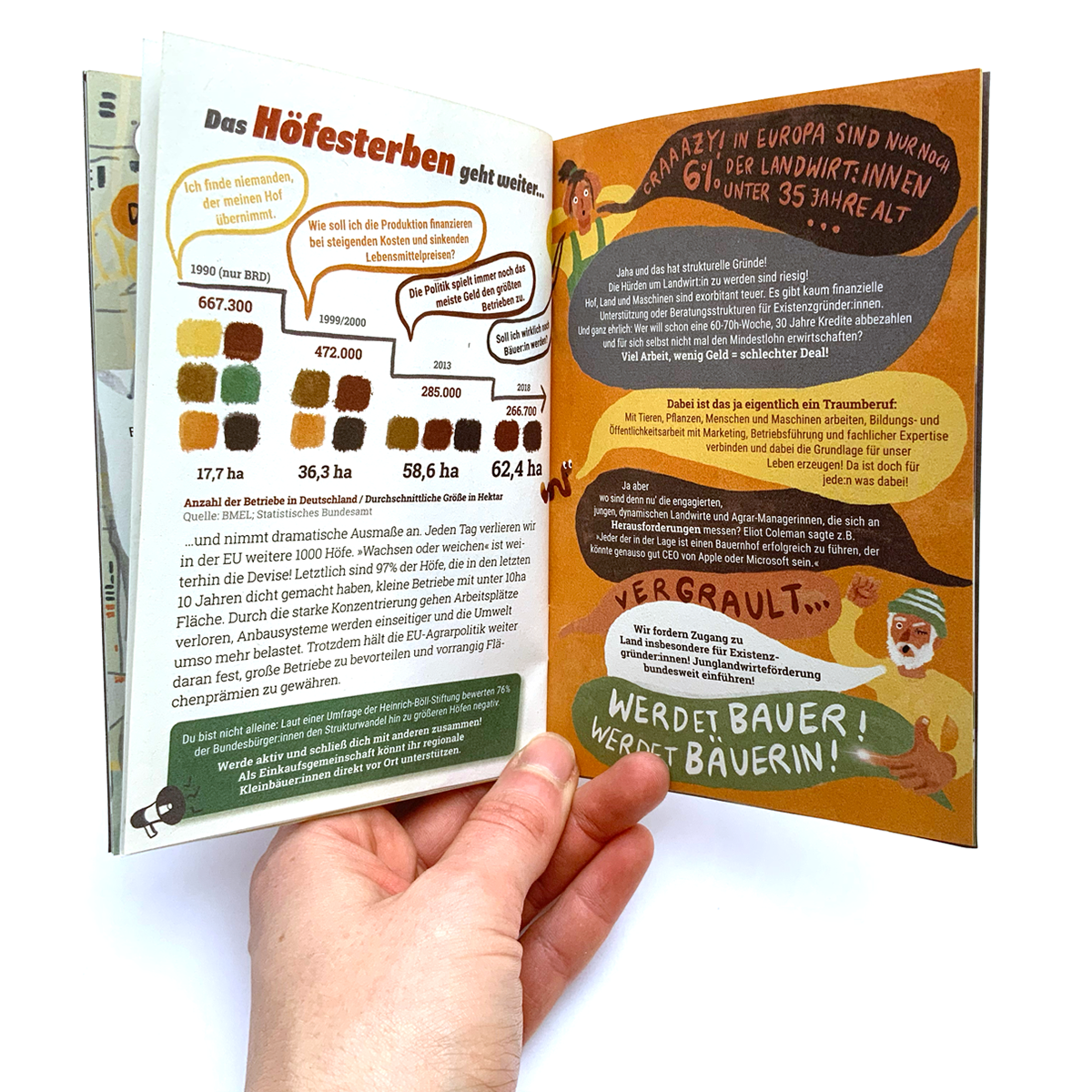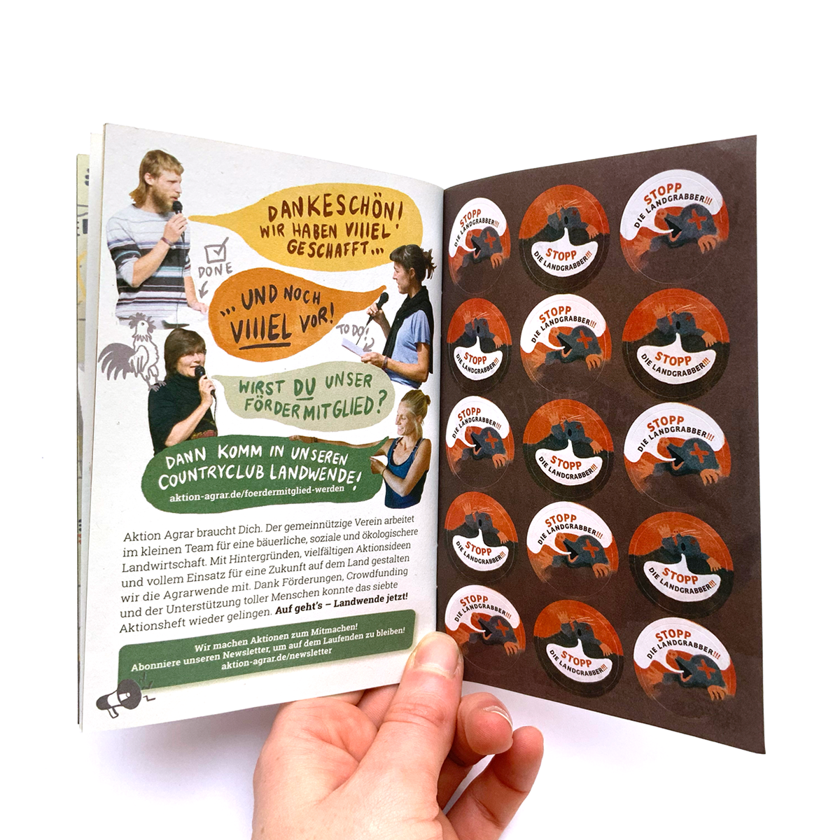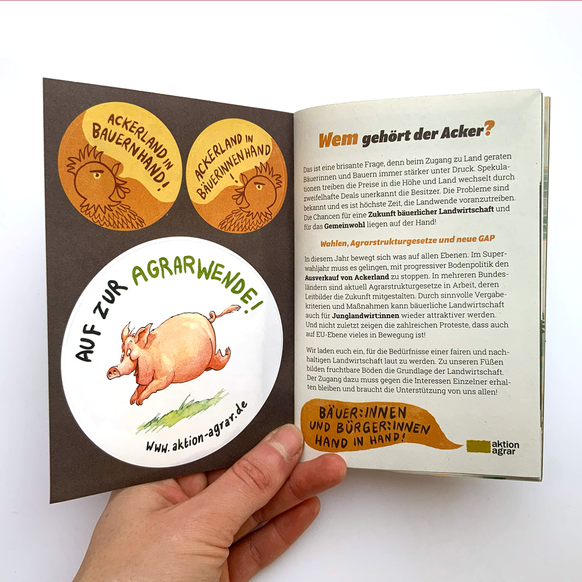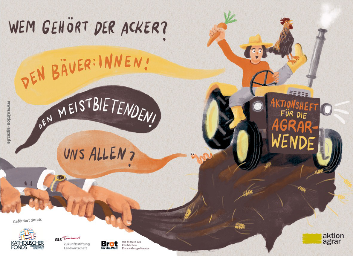 Illustration und Layout Aktionsheft für die Agrarwende 2021, Schwerpunkt-Thema: Bodenpolitik: Wem gehört der Acker? Heft bestellen?